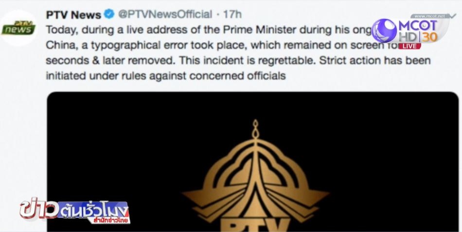 ปากีสถาน 5 พ.ย. – สถานีโทรทัศน์พีทีวีของทางการปากีสถาน ออกแถลงการณ์ขอโทษอย่างเป็นทางการบนทวิตเตอร์ กรณีใส่ชื่อกรุงปักกิ่งของจีนบนหน้าจอโทรทัศน์ผิด แทนที่จะใส่ว่า Beijing กลับใส่คำว่า “Begging” ซึ่งแปลว่าการร้องขอ โดยคำผิดนี้ปรากฏบนหน้าจอทีวีเป็นเวลาราว 20 วินาที ในระหว่างที่นายกรัฐมนตรีอิมราน ข่าน กำลังแถลงสดอยู่ที่กรุงปักกิ่ง แต่ต่อมาภายหลังได้มีการลบคำผิดออกไปแล้ว