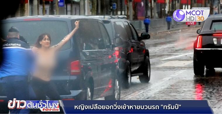 ฝรั่งเศส 11 พ.ย.-ผู้ประท้วงหญิง เปลือยอกวิ่งเข้าหาขบวนรถของประธานาธิบดีโดนัลด์ ทรัมป์ ขณะไปร่วมพิธีรำลึก 100 ปี วันสิ้นสุดสงครามโลกครั้งที่ 1 ที่กรุงปารีส