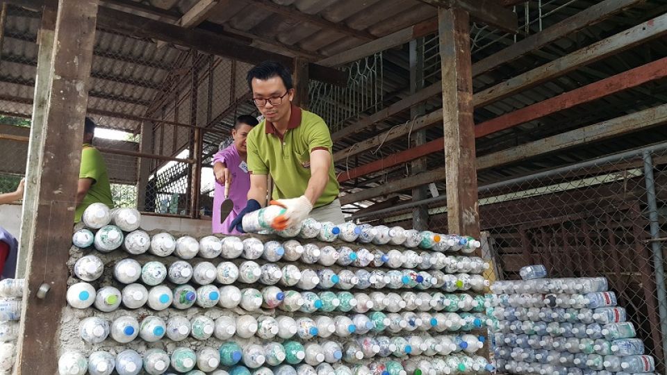 Recycled plastic bottles were stuffed with plastic waste to make free building materials or ecobricks to replace regular bricks in the construction of the toilet walls at the garbage sorting building in the hospital’s premises.