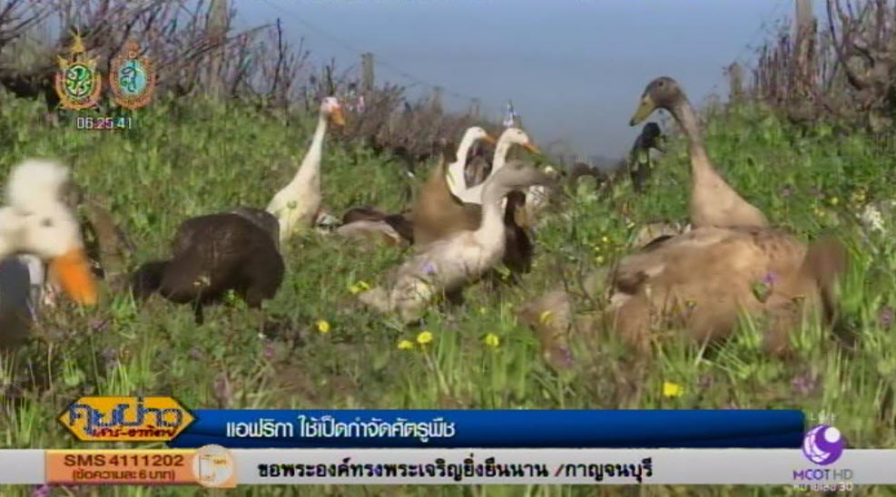 แอฟริกาใต้ 10 ก.ย. – ไร่องุ่นในแอฟริกาใต้เมินยาฆ่าแมลง ด้วยการใช้เป็ดเป็นตัวช่วยขับไล่และควบคุมศัตรูพืชตัวฉกาจของผลผลิตในไร่แทน