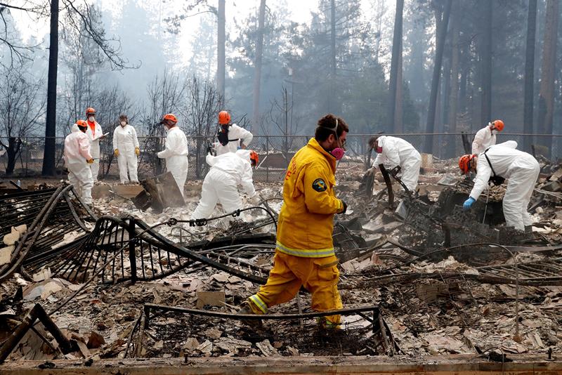 เจ้าหน้าที่ที่ได้รับการฝึกพิสูจน์อัตลักษณ์บุคคลประมาณ 100 คนของกองกำลังพิทักษ์แห่งชาติจะช่วยงานคณะค้นหาและกู้ภัยที่นำโดยเจ้าหน้าที่ชันสูตรศพและนักมานุษยวิทยานิติเวชที่อยู่ในพื้นที่ ค้นหาผู้เสียชีวิตเพิ่มเติมจากที่พบแล้ว 48 คน เมืองพาราไดซ์อยู่ห่างจากนครซานฟรานซิสโกขึ้นไปทางเหนือ 280 กิโลเมตรถูกไฟป่าแคมป์ไฟร์ ซึ่งเป็นไฟป่าขนาดใหญ่เผามาตั้งแต่วันพฤหัสบดีที่แล้ว ไฟลามอย่างรุนแรงเนื่องจากมีพุ่มไม้แห้งหนาทึบเป็นเชื้อเพลิง ประกอบกับมีลมพัดแรง ส่วนไฟป่าวูลซีไฟร์ที่ไหม้ทางตอนใต้ของรัฐแคลิฟอร์เนีย มีผู้เสียชีวิตแล้ว 2 คน