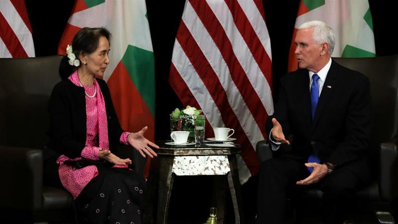 สิงคโปร์ 14 พ.ย.- รองประธานาธิบดีไมค์ เพนซ์ของสหรัฐกล่าวกับนางอองซานซูจีผู้นำเมียนมาวันนี้ว่า ความรุนแรงและการกวาดล้างชาวโรฮิงญาของกองทัพและกลุ่มชาวบ้านในเมียนมา จนทำให้ชาวโรฮิงญากว่า 700,000 คนต้องอพยพไปบังกลาเทศ เป็นเรื่องที่ให้อภัยไม่ได้