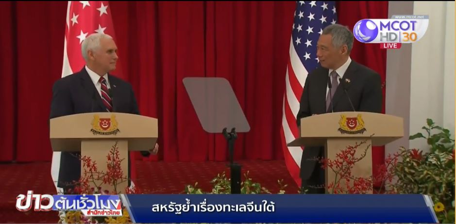สิงคโปร์ 16 พ.ย. – นายไมค์ เพนซ์ รองประธานาธิบดีสหรัฐ พบหารือกับนายลี เซียนลุง นายกรัฐมนตรีสิงคโปร์ หลังเสร็จสิ้น การประชุมสุดยอดอาเซียนที่สิงคโปร์ เขาได้เรียกร้องให้กลุ่มอาเซียนดำเนินการจัดทำแนวทางปฏิบัติในทะเลจีนใต้ให้สำเร็จลุล่วง โดยย้ำว่าทะเลจีนใต้ไม่ใช่ของชาติหนึ่งชาติใด สหรัฐจะแล่นเรือผ่านและนำเครื่องบินบินเหนือบริเวณใดก็ได้ ตามที่กฎหมายระหว่างประเทศอนุญาตให้ทำได้