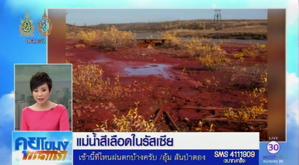 หน่วยงานปกป้องสภาพแวดล้อมของรัสเซีย และกลุ่มกรีนพีซ เร่งตรวจสอบสาเหตุแม่น้ำดาลดีกันในเมืองนอร์ริลส์ใกล้มหาสมุทรอาร์กติก ทางตอนเหนือแคว้นไซบีเรีย กลายเป็นสีแดงเข้มเหมือนเลือดนก