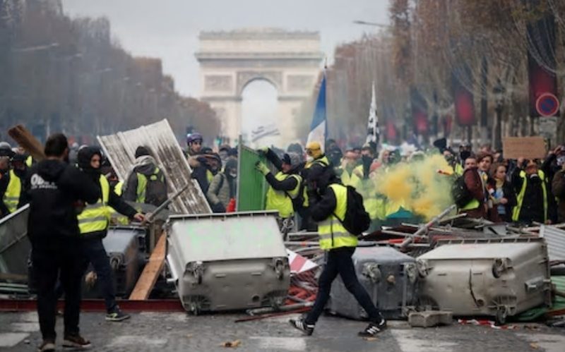ทำเนียบประธานาธิบดีฝรั่งเศสแถลงว่า ประธานาธิบดีจะแถลงต่อประชาชนทั้งประเทศในวันอังคารเรื่องช่วงเวลาหัวเลี้ยวหัวต่อด้านระบบนิเวศที่ทำให้รัฐบาลต้องดำเนินนโยบายที่เป็นมิตรต่อสิ่งแวดล้อม และจะกล่าวถึงการประท้วงที่เกิดขึ้นเมื่อวันเสาร์ ตำรวจระบุว่า ผู้ประท้วงทำลายร้านค้าหรูและเสาไฟสัญญาณจราจรในย่านนั้น มีผู้บาดเจ็บร่วม 30 คน และถูกจับกุม 101 คนจากการปะทะกับตำรวจ รัฐบาลโทษว่า เหตุรุนแรงเกิดจากกลุ่มขวาจัดที่มีจำนวนน้อย ก่อกวนในช่วงที่ผู้ชุมนุมสวมเสื้อกั๊กเหลืองประมาณ 8,000 คนปักหลักชุมนุมมาเป็นสัปดาห์