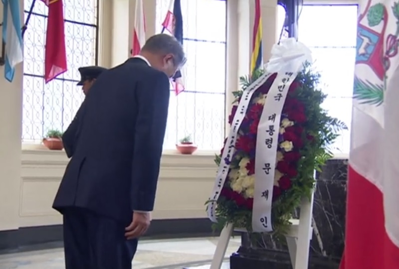 ออกแลนด์ 3 ธ.ค.- ประธานาธิบดีมุน แจอินของเกาหลีใต้และนางคิม จ็องซุกภริยา ร่วมวางพวงหรีดที่พิพิธภัณฑ์อนุสรณ์สงครามในวันจันทร์ นับเป็นการเยือนนิวซีแลนด์อย่างเป็นทางการครั้งแรกของประธานาธิบดีเกาหลีใต้และภริยา