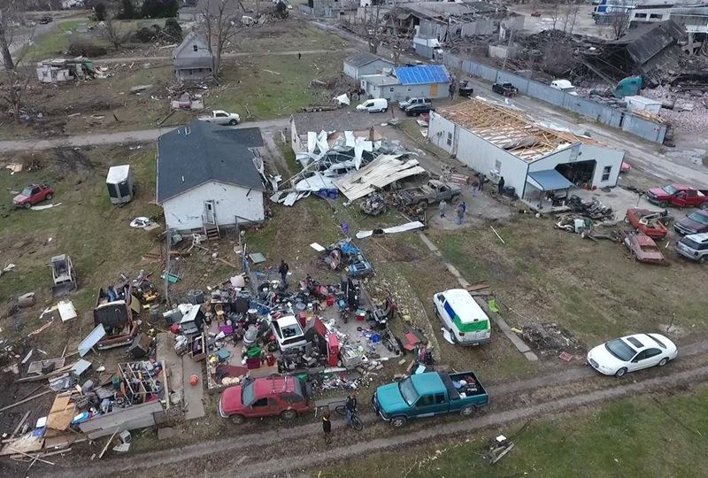 อิลลินอยส์ 4 ธ.ค.- สำนักงานขนส่งรัฐอิลลินอยส์ของสหรัฐเผยแพร่ภาพถ่ายทางอากาศจากโดรนพบสภาพความเสียหายเป็นบริเวณกว้างจากพายุทอร์นาโดหลายลูกที่ไม่พบบ่อยนักในเดือนธันวาคม รวมทั้งทอร์นาโดลูกหนึ่งซึ่งมีความกว้างถึง 805 เมตร ทำให้มีผู้บาดเจ็บอย่างน้อย 20 คน