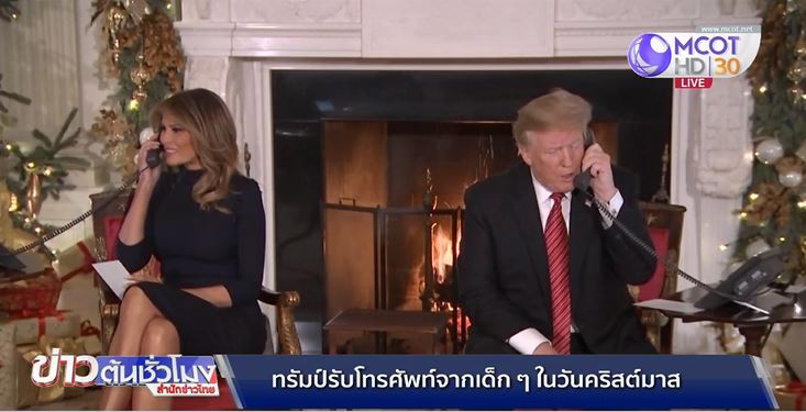 ประธานาธิบดีโดนัลด์ ทรัมป์ ผู้นำสหรัฐ และนางเมลาเนีย ทรัมป์ สตรีหมายเลขหนึ่ง ร่วมรับสายโทรศัพท์จากเด็กๆ เนื่องในคืนคริสต์มาสอีฟก่อนถึงเทศกาลคริสต์มาส โดยในช่วงหนึ่งทรัมป์พูดคุยกับเด็กชายวัย 7 ขวบเกี่ยวกับเรื่องซานตาคลอส ก่อนถามกลับว่ายังเชื่อเรื่องซานตาคลอสอยู่อีกหรือ พร้อมกับหัวเราะออกมา ที่ผ่านมา เด็กๆ จากทั่วโลกจะโทรศัพท์เข้ามายังกองบัญชาการป้องกันภัยทางอากาศอเมริกาเหนือ ซึ่งมีภารกิจอย่างหนึ่งคือตามรอยซานตาคลอสทั่วโลกและเปิดทำการช่วงคริสต์มาสทุกปี เป็นธรรมเนียมปฏิบัติซึ่งเริ่มมีมาตั้งแต่ปี 2498.-สำนักข่าวไทย
