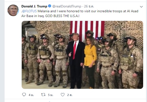 วอชิงตัน 28 ธ.ค. – ประธานาธิบดีโดนัลด์ ทรัมป์ ของสหรัฐอาจจะเปิดเผยใบหน้าของสมาชิกหน่วยซีลอย่างไม่ตั้งใจในขณะที่เขาเดินทางไปเยี่ยมทหารอเมริกันในอิรักในสัปดาห์นี้