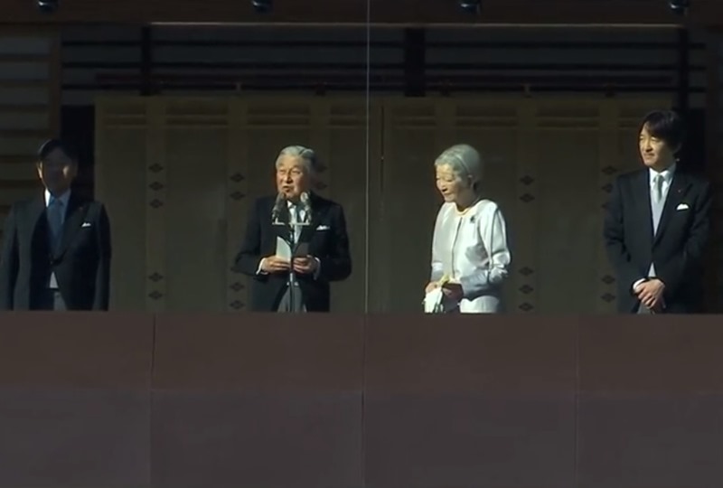 สมเด็จพระจักรพรรดิอากิฮิโต พระชนมพรรษา 85 พรรษาเสด็จออกหน้ามุขพร้อมกับสมเด็จพระจักรพรรดินีมิชิโกะและพระบรมวงศานุวงศ์ โดยมีประชาชนมาเข้าเฝ้าถวายพระพรหน้าพระราชวังอิมพีเรียลกว่า 114,600 คนในช่วงสายวันนี้ ทรงมีพระราชดำรัสว่า ขอสวัสดีปีใหม่กับทุกคน ทรงพระเกษมสำราญมากที่ได้ฉลองปีใหม่กับพสกนิกรภายใต้ท้องฟ้าปลอดโปร่งสดใส หวังว่าปีนี้จะเป็นปีที่ดีสำหรับทุกคน ทรงภาวนาให้ญี่ปุ่นและทั่วโลกมีแต่สันติภาพและความสุข ผู้เข้าเฝ้าหลายคนเปล่งเสียงสำนึกในพระมหากรุณาธิคุณระหว่างที่ทรงโบกพระหัตถ์ บางคนร้องเพลงชาติญี่ปุ่น สตรีคนหนึ่งปาดน้ำตาขณะมองขึ้นไปที่พระองค์ ขณะที่นักศึกษาคนหนึ่งเผยว่า มากับมารดาเพื่อเก็บภาพเข้าเฝ้าพระองค์ไว้ในความทรงจำตลอดไป