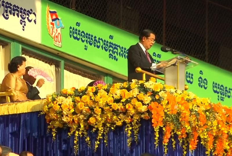 นายกรัฐมนตรีฮุน เซนวัย 66 ปีกล่าวในสนามกีฬาโอลิมปิกที่มีคณะนางรำและวงโยธวาทิตร่วมการแสดงว่า วันนี้ชาวกัมพูชามาร่วมในพิธีฉลองเพื่อรำลึกถึงความทรงจำอันไม่สามารถลืมเลือนได้เกี่ยวกับอาชญากรรมอันโหดเหี้ยมของกลุ่มนายพล พต และขอขอบคุณเวียดนามที่ช่วยกัมพูชาเอาไว้ นายกรัฐมนตรีฮุน เซนซึ่งปกครองกัมพูชามา 33 ปี ใช้โอกาสนี้โจมตีประเทศที่ยังคงสนับสนุนกลุ่มเขมรแดงที่ถูกโค่นล้มไปตั้งแต่ปี 2522 โดยไม่ระบุชื่อว่า ประเทศเหล่านี้คุยอวดเรื่องมนุษยธรรม สิทธิมนุษยชน และประชาธิปไตย แต่กลับขัดขวางอย่างไม่เป็นธรรมเมื่อประชาชนต้องการความช่วยเหลือจากประชาคมโลก ผู้นำกัมพูชาประกาศด้วยว่า ไม่ยอมรับการเคลื่อนไหวของกลุ่มการเมืองสุดโต่งและกลุ่มนักวิจารณ์ที่อยู่เบื้องหลังคนเหล่านี้ เพราะพยายามผลักไสกัมพูชาให้พ้นจากเส้นทางประชาธิปไตย