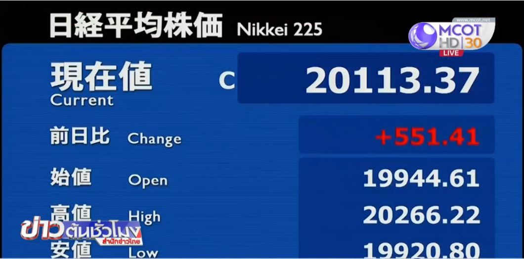 นักวิเคราะห์ชี้ว่า การที่ดัชนีตลาดหุ้นขยับขึ้นในวันนี้ เป็นการรีบาวด์จากสัปดาห์ก่อนที่หุ้นดิ่งลงจากความกังวลเรื่องสงครามการค้าระหว่างจีนกับสหรัฐ รวมทั้งการแจ้งเตือนเรื่องผลประกอบการของแอปเปิล ในวันนี้ดัชนีนิกเกอิของญี่ปุ่นปรับขึ้นกว่า 2% หรือ 477.01 จุด ปิดที่ 20,038.97 จุด . – สำนักข่าวไทย