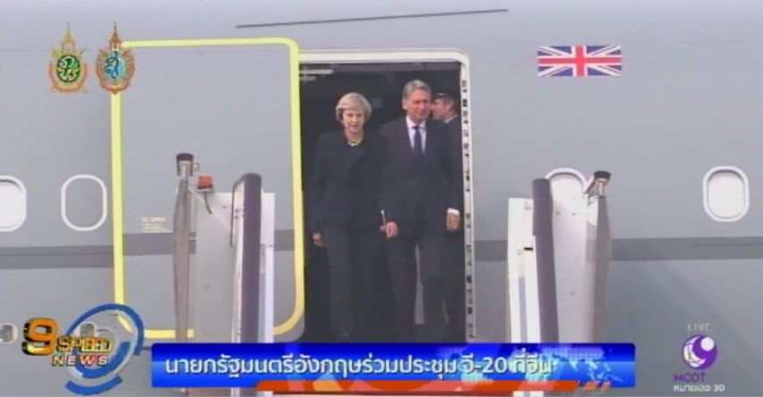 จีน 4 ก.ย. – นางเทราซ่า เมย์ นายกรัฐมนตรีอังกฤษ เดินทางถึงสนามบินนานาชาติเสี่ยวชาน เมืองหางโจว มณฑลเจ้อเจียงของจีน เพื่อร่วมประชุมสุดยอด จี-20 ก่อนหน้าเดินทางมาจีนนางเมย์ กล่าวถึงความสัมพันธ์ระหว่างอังกฤษกับจีนว่ากำลังอยู่ในยุคทอง แต่ไม่กล่าวถึงเรื่องที่เธอยับยั้งข้อตกลงเกี่ยวกับโรงไฟฟ้าพลังนิวเคลียร์ ที่จีนมีส่วนสนับสนุนด้านการเงิน สำหรับการประชุมสุดยอดจี-20 ที่จีนนี้ จะมีบุคคลสำคัญ เช่นประธานาธิบดีบารัก โอบามา ประธานาธิบดีสหรัฐ นางอังเกลา แมร์เคิล นายกรัฐมนตรีเยอรมนี มาร่วมประชุมด้วย. -สำนักข่าวไทย