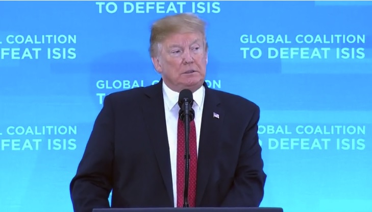 นายทรัมป์ กล่าวต่อที่ประชุมรัฐมนตรีต่างประเทศและเจ้าหน้าที่อาวุโสจาก 79 ประเทศที่ร่วมปฎิบัติการกับสหรัฐในการต่อสู้กับกลุ่มไอเอสในซีเรียและอิรัก ว่าพื้นที่ยึดครองของไอเอสไม่มีเหลือแล้ว ซึ่งถือเป็นปัจจัยสำคัญมาก กองทัพสหรัฐและหุ้นส่วนที่เป็นพันธมิตรสามารถปลดปล่อยดินแดนเกือบจะทั้งหมดที่ไอเอสเคยยึดครองไว้ในซีเรียและอิรัก โดยเขาคาดว่า จะสามารถประกาศอย่างเป็นทางการในช่วงสัปดาห์หน้า ว่าสามารถยึดคืนพื้นที่คืนจากไอเอสได้ 100%