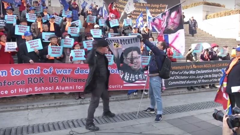 กลุ่มต่อต้านสองกลุ่มซึ่งมีชาวเกาหลีเหนือแปรพักตร์รวมอยู่ด้วย ชุมนุมใกล้สถานทูตสหรัฐ ใช้คัตเตอร์กรีดแผ่นผ้ารูปนายคิม จองอึน ผู้นำเกาหลีเหนือ นายคิม อิลซุง ผู้ก่อตั้งเกาหลีเหนือ นายคิม จองอิล บิดาของนายคิม จองอึน และธงชาติเกาหลีเหนือ แกนนำกลุ่มต่อต้านกลุ่มหนึ่งกล่าวว่า ต้องการบอกประธานาธิบดีโดนัลด์ ทรัมป์ของสหรัฐว่า ไม่ควรตกเป็นเหยื่อให้เกาหลีเหนือใช้ยุทธศาสตร์สันติภาพจอมปลอมมาบงการ ความจริงคือเกาหลีเหนือพยายามทำให้ทั้งคาบสมุทรเกาหลีเป็นคอมมูนในระบอบคอมมิวนิสต์มาตลอด 70 ปีและจะไม่มีวันเปลี่ยนใจ หวังว่าประธานาธิบดีทรัมป์จะพยายามอย่างเต็มที่เพื่อปลดนิวเคลียร์เกาหลีเหนืออย่างสมบูรณ์ และขอให้ประธานาธิบดีทรัมป์รู้ว่าเกาหลีใต้จะไม่ยอมให้สหรัฐถอนกำลังออกไป