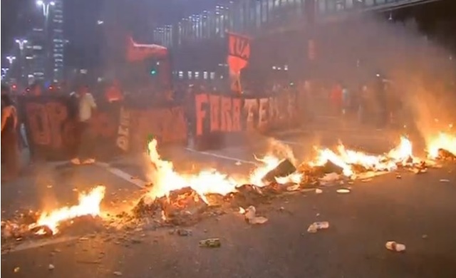 เจ้าหน้าที่ตำรวจปราบจลาจลนำกำลังเข้าสลายการชุมนุมของกลุ่มผู้ประท้วงหลายพันคน บริเวณถนนเปาลิสตา ศูนย์กลางของนครเซาเปาโล โดยเหตุประท้วงดังกล่าวเกิดขึ้นขณะที่นางรุสเซฟฟ์ ซึ่งถูกสั่งระงับการปฏิบัติหน้าที่กรณีจงใจตกแต่งบัญชีเพื่อปกปิดสถานะการคลังของรัฐบาล ให้การปกป้องตนเองจากคำกล่าวหาดังกล่าวต่อสมาชิกวุฒิสภาของบราซิล ในกรุงบราซิเลีย เหล่าผู้ประท้วงรวมตัวปิดถนน พร้อมทั้งเผาถังขยะและแนวกั้นในนครเซาเปาโล ขณะเดียวกัน มีผู้สนับสนุนนางรุสเซฟฟ์อีกกว่า 2,000 คน ร่วมชุมนุมใกล้วุฒิสภาในกรุงบราซิเลีย และอีกนับร้อยคนรวมตัวประท้วงในนครรีโอเดจาเนโร