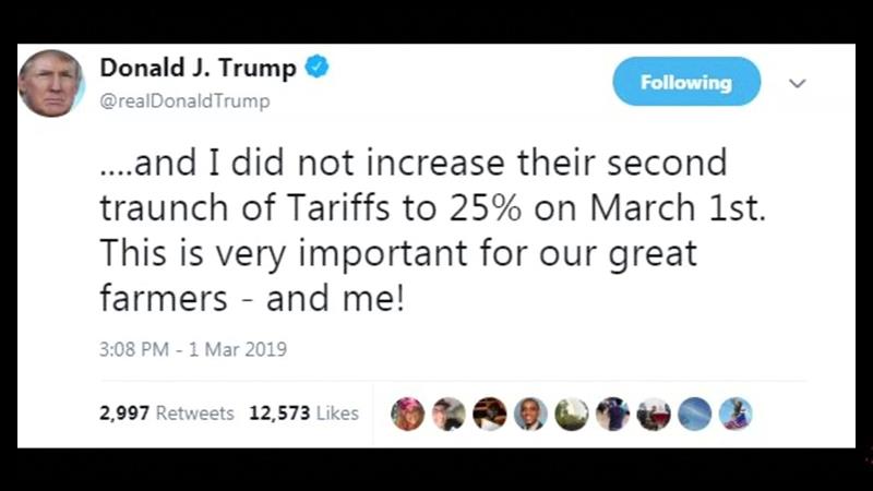 ประธานาธิบดีทรัมป์ทวีตเมื่อวันศุกร์ตามเวลาสหรัฐว่า ได้ขอให้จีนยกเลิกการเก็บภาษีสินค้าเกษตรของสหรัฐทั้งหมดโดยทันที เป็นไปตามข้อเท็จจริงที่ว่าการเจรจาการค้ากำลังดำเนินไปด้วยดี และเขาก็ยังไม่ขึ้นภาษีสินค้าจีนจากร้อยละ 10 เป็นร้อยละ 25 หลังพ้นวันที่ 1 มีนาคมตามที่รับปากไว้ เรื่องนี้มีความสำคัญอย่างยิ่งต่อเกษตรกรของสหรัฐและต่อตัวเขา