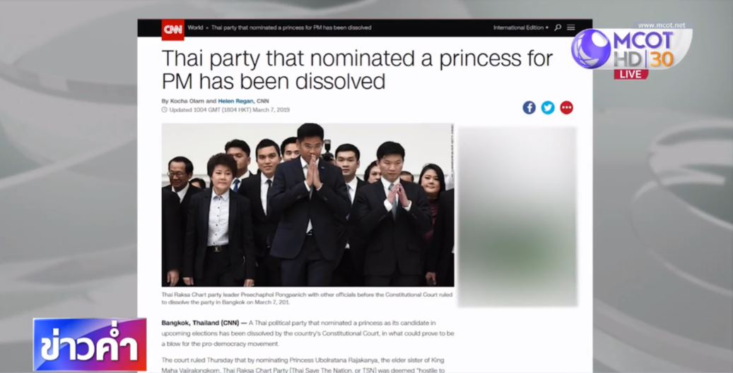 7 มี.ค. – สำนักข่าวต่างประเทศติดตามรายงานข่าวการยุบพรรคไทยรักษาชาติเช่นกัน โดยตลอดวัน สำนักข่าวต่างประเทศรายงานข่าวศาลรัฐธรรมนูญของไทยมีคำวินิจฉัยยุบพรรคไทยรักษาชาติ ไม่ว่าจะเป็นสำนักข่าวซีเอ็นเอ็น บีบีซี รอยเตอร์ส เป็นต้น แต่ละสำนักข่าวได้นำเสนอข้อมูลถึงที่มาที่ไปรายละเอียดซึ่งนำมาสู่การตัดสินยุบพรรค แต่ต่างก็วิเคราะห์ว่าการยุบพรรคไทยรักษาชาติจะส่งผลกระทบทำให้โอกาสของพรรค ซึ่งแนวร่วมหรือขั้วเดียวกันที่จะได้ครองเสียงข้างมากในสภามีน้อยลง.- สำนักข่าวไทย