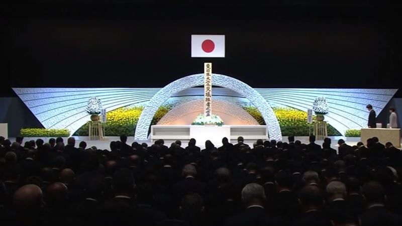 นายกรัฐมนตรีชินโซ อาเบะ สมาชิกสภาและครอบครัวผู้ประสบภัย วางดอกไม้และ โค้งคำนับในพิธีที่จัดขึ้นในกรุงโตเกียวเมื่อถึงเวลา 14.46 น.วันนี้ตามเวลาท้องถิ่น ตรงกับเวลา 12.46 น.วันนี้ตามเวลาในไทย เป็นเวลาเดียวกับที่เกิดแผ่นดินไหวขนาด 9.0 ในวันนี้เมื่อปี 2554 นายกรัฐมนตรีอาเบะกล่าวว่า ได้แต่เศร้าใจเมื่อนึกถึงความรู้สึกของผู้ที่ต้องสูญเสียบุคคลอันเป็นที่รักไปกับเหตุการณ์นี้ การบูรณะฟื้นฟูตลอดแปดปีที่ผ่านมามีความคืบหน้าอย่างต่อเนื่อง แต่รัฐบาลก็จะเดินหน้าช่วยเหลือผู้ที่ยังมีความเป็นอยู่ยากลำบากต่อไป ส่วนที่เมืองตามริมฝั่งที่ประสบภัยก็มีการจัดพิธีรำลึกเช่นเดียวกัน อย่างไรก็ดี ปีนี้สมเด็จพระจักรพรรดิอากิฮิโตะและสมเด็จพระจักรพรรดินีมิชิโกะไม่ได้เสด็จร่วมงาน ทรงให้เจ้าชายอากิชิโน พระราชโอรสพระองค์รองและเจ้าหญิงกิโกะ พระชายาเสด็จแทน