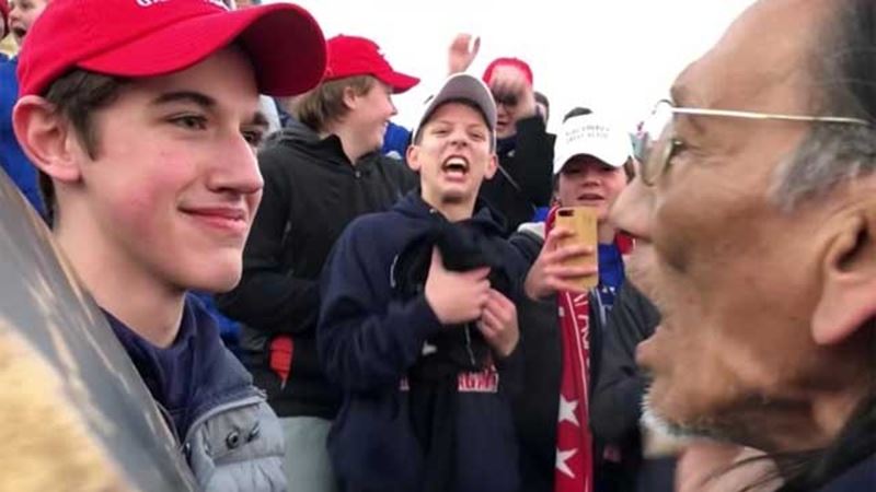 ภาพนิ่งและคลิปที่มีการส่งต่อในโลกออนไลน์อย่างกว้างขวาง เห็นนายแซนด์มานน์ยืนจ้องและยิ้มให้นายนาธาน ฟิลิป นักเคลื่อนไหวชนพื้นเมืองอเมริกันที่กำลังร้องเพลงและตีกลองอยู่ตรงหน้า นักท่องโลกออนไลน์หลายคนตีความไปว่า นักเรียนกลุ่มนี้กำลังล้อเลียนนายนายฟิลิป ด้านเขตปกครองโรมันคาทอลิกแห่งโควิงตัน รัฐเคนทักกีได้เปิดการสอบสวนเหตุการณ์ที่เกิดขึ้นและได้ข้อสรุปเมื่อเดือนก่อนว่า ไม่มีหลักฐานว่านักเรียนกลุ่มนี้ยั่วยุให้เกิดการเผชิญหน้า แต่เด็กกลุ่มนี้ซึ่งไปร่วมการเดินขบวนต่อต้านการทำแท้ง เป็นฝ่ายถูกกลุ่มผู้ประท้วงชาวอเมริกันเชื้อสายแอฟริกันใช้ถ้อยคำดูหมิ่น เด็ก ๆ จึงตอบโต้โดยได้รับอนุญาตจากครูพี่เลี้ยงให้ตะโกนคำขวัญโรงเรียน ก่อนที่นายฟิลิปจะแทรกเข้ามาร้องเพลงและตีกลองในบริเวณนั้น