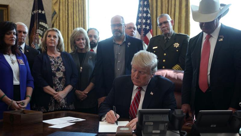 ประธานาธิบดีทรัมป์กล่าวที่ห้องทำงานรูปไข่ในทำเนียบขาว รายล้อมไปด้วยเจ้าหน้าที่ศุลกากรและตระเวนชายแดน ครอบครัวผู้ถูกคนลอบเข้าเมืองฆาตกรรม และนายวิลเลียม บารร์ รัฐมนตรียุติธรรมคนใหม่ว่า สภามีอิสระที่จะผ่านญัตตินี้ และเขาก็มีหน้าที่ที่ต้องใช้สิทธิยับยั้ง เพราะญัตติค้านการประกาศเหตุฉุกเฉินแห่งชาติทำให้ชีวิตชาวอเมริกันนับไม่ถ้วนตกอยู่ในอันตราย และไม่มีเหตุฉุกเฉินใดร้ายแรงไปกว่าเหตุฉุกเฉินที่พรมแดนทางใต้ในขณะนี้ จากนั้นได้ส่งกลับญัตติให้สภาผู้แทนราษฎรโดยไม่ลงนามเห็นชอบ นับเป็นการใช้สิทธิยับยั้งในฐานะประธานาธิบดีครั้งแรกตั้งแต่เข้ารับตำแหน่งเมื่อ 2 ปีก่อน ขณะนี้สภาผู้แทนราษฎรอยู่ระหว่างพักสมัยประชุมนาน 1 สัปดาห์ และคาดว่าจะไม่ได้เสียงสองในสามที่จะสามารถทำให้การใช้สิทธิยับยั้งของประธานาธิบดีเป็นโมฆะได้ ญัตติ