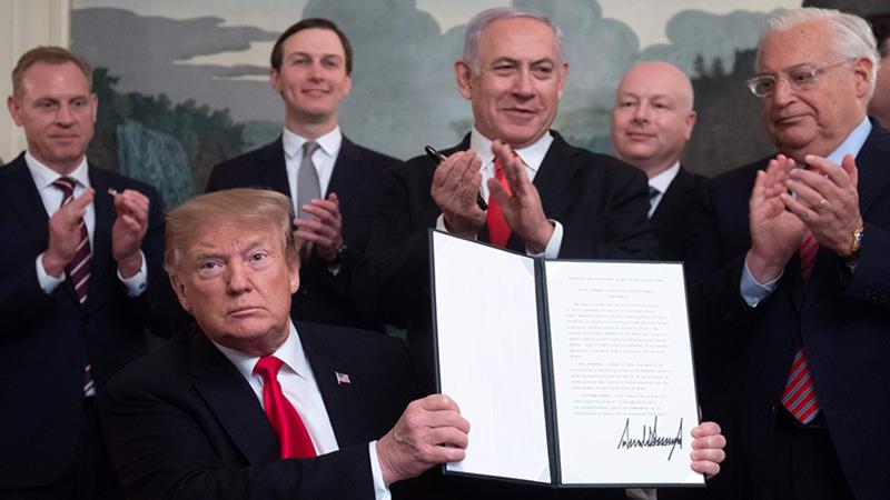 ประธานาธิบดีโดนัลด์ ทรัมป์ลงในนามประกาศเมื่อวันจันทร์ว่า สหรัฐรับรองการที่อิสราเอลผนวกที่ราบสูงโกลัน หลังยึดได้จากซีเรียในการทำสงครามหกวันปี 2510 แล้วผนวกในปี 2523 ซีเรียจึงได้ขอให้ยูเอ็นเอสซีเปิดประชุมเรื่องนี้เพราะสหรัฐละเมิดมติยูเอ็นสามฉบับที่เรียกร้องให้อิสราเอลถอนตัวจากที่ราบสูงโกลันเนื่องจากเป็นการกระทำที่นานาชาติไม่ยอมรับ อังกฤษ ซึ่งเป็นพันธมิตรใกล้ชิดที่สุดของสหรัฐระบุว่า การตัดสินใจของสหรัฐละเมิดมติ 497 ที่ประกาศให้การผนวกที่ราบสูงโกลันเป็นโมฆะ ขณะที่ฝรั่งเศสเตือนว่า ความพยายามที่ไม่เป็นไปตามกฎหมายสากลจะล้มเหลว ซึ่งหมายถึงเรื่องที่สหรัฐเตรียมยื่นข้อเสนอกระบวนการสันติภาพ ด้านรัสเซียเรียกร้องรัฐบาลต่าง ๆ ไม่ยอมรับการตัดสินใจของสหรัฐและถือว่าที่ราบสูงโกลันเป็นดินแดนที่ถูกอิสราเอลยึดครองต่อไป ส่วนจีนคัดค้านการดำเนินการแต่ฝ่ายเดียวเพื่อพยายามเปลี่ยนแปลงข้อเท็จจริงที่ว่ามติยูเอ็นประกาศให้ที่ราบสูงโกลันเป็นดินแดนที่ถูกอิสราเอลยึดครอง