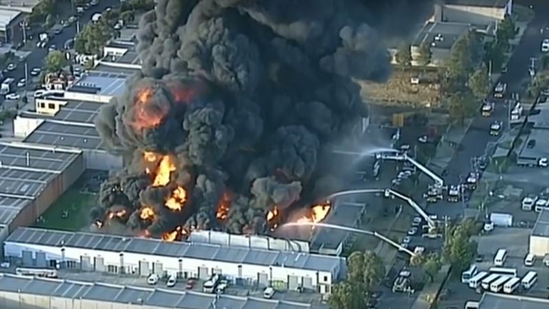 เมลเบิร์น 5 เม.ย.- นักดับเพลิงถึง 100 คนร่วมสกัดไฟไหม้โรงงานขยะอุตสาหกรรมในนครเมลเบิร์นของออสเตรเลียวันนี้ ระเบิดทุกสิ่งขึ้นสู่ท้องฟ้าและส่งกลุ่มควันทึบสีดำทั่วเมือง