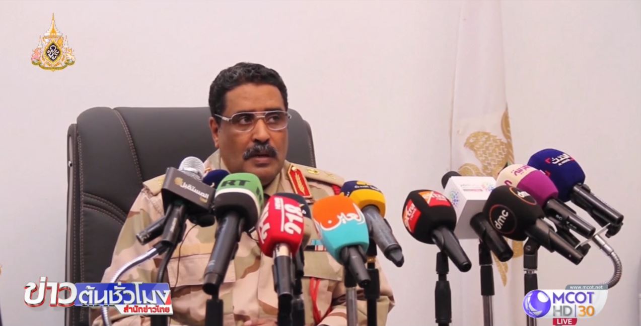 ลิเบีย 7 เม.ย. – พลจัตวา อาเหม็ด อัล เมสมารี โฆษกกองทัพแห่งชาติลิเบีย ซึ่งนำโดยนายคาลิฟา ฮิฟเตอร์ ผู้ออกคำสั่งให้กองทัพบุกเข้ายึดอำนาจรัฐบาลลิเบีย แถลงว่า กองกำลังฝ่ายรัฐบาลได้ส่งเครื่องบินเข้าโจมตีที่มั่นของฝ่ายตนในเมืองอัล อาซิซิยา ถึง 4 ครั้ง ทำให้บ้านหลังหนึ่งของพลเรือนถูกโจมตีและเสียชีวิต นับจากนี้หากเครื่องบินของฝ่ายตรงข้ามขึ้นจากสนามบินที่ใดก็ตาม และมีเป้าหมายโจมตีฝ่ายตน ตนจะโจมตีกลับในทันที