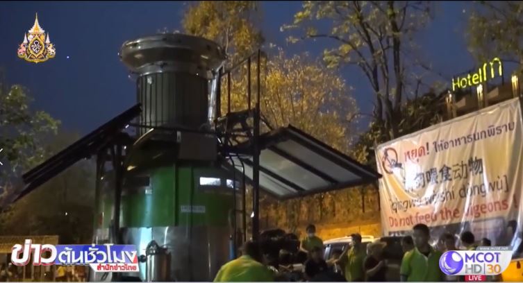 The giant air filter was sent from Khon Kaen province. It has an electric fan that revolves at 700 rounds per minute and sucks dust into the machine where water catches it.