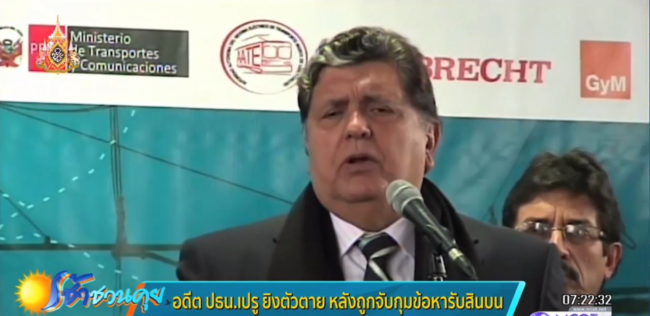 นายอลัน การ์เซีย อดีตประธานาธิบดีเปรู วัย 69 ปี ใช้อาวุธปืนยิงตัวเองบริเวณศีรษะในระหว่างที่ตำรวจยกกำลังบุกเข้าจับกุมเขาที่บ้านพักกลางกรุงลิมา หวังนำตัวไปสอบสวนข้อกล่าวหารับสินบนจากบริษัทก่อสร้างแห่งหนึ่งของบราซิล