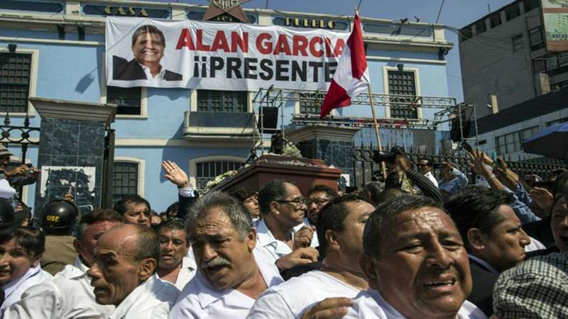 ผู้สนับสนุนนายการ์เซียไปรวมตัวกันที่สำนักงานใหญ่พรรคเอพีอาร์เอของเขา หลายคนร่ำไห้อย่างเปิดเผยและร้องเพลงประจำพรรค ขณะที่คนใกล้ชิดแบกโลงศพของเขาขึ้นรถบรรทุกศพ ไปประกอบพิธีฌาปนกิจเป็นการภายใน นายการ์เซียยิงตัวตายขณะตำรวจนำหมายจับไปที่บ้านพักเมื่อเช้าวันพุธตามเวลาท้องถิ่น เพื่อควบคุมตัวในเบื้องต้นเป็นเวลา 10 วัน ป้องกันการหลบหนีและให้ทางการมีเวลารวบรวมหลักฐาน เพราะปีที่แล้วเขาเคยหนีเข้าไปขอลี้ภัยในสถานทูตอูรุกวัย หลังจากศาลสั่งห้ามออกนอกประเทศเป็นเวลา 18 เดือน สถานทูตให้เขาพักอยู่ 16 วัน แต่ไม่ให้ลี้ภัย