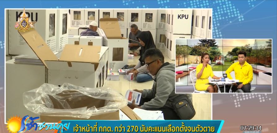 อินโดนีเซีย 29 เม.ย.- เจ้าหน้าที่คณะกรรมการการเลือกตั้งอินโดนีเซียกว่า 270 คน เสียชีวิต และอีกกว่า 1,800 คน ล้มป่วย สาเหตุมาจากอาการเหนื่อยล้าจากการนับคะแนนการเลือกตั้งที่ผ่านพ้นไปแล้วกว่า 10 วัน