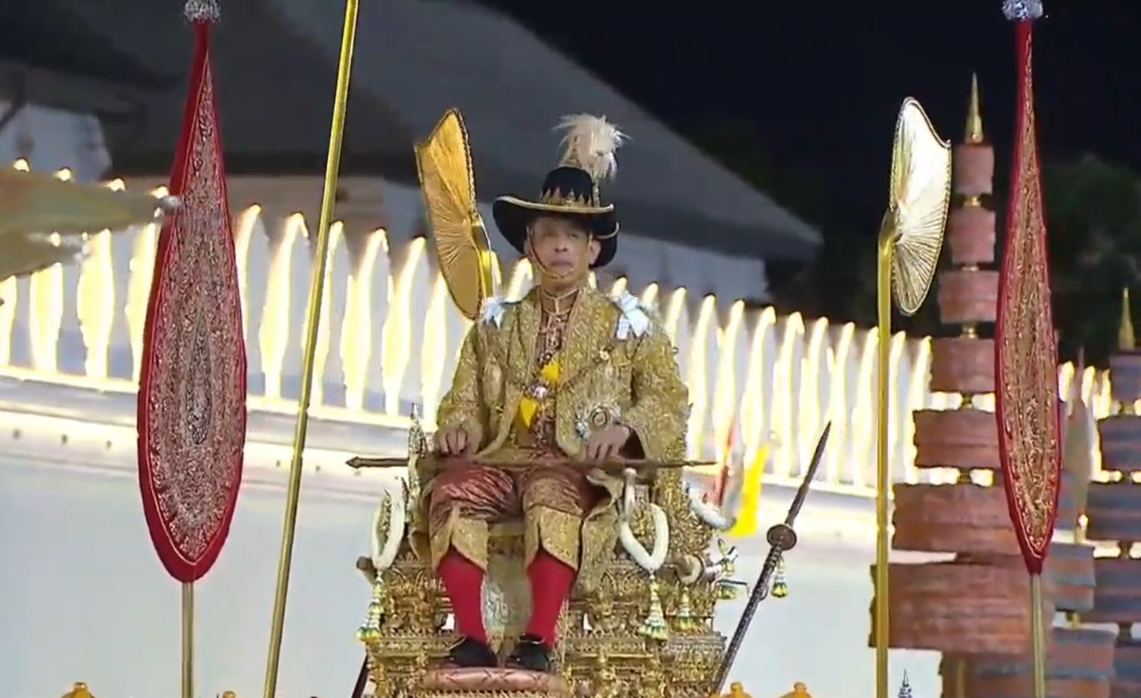 King Rama X sat on the Budtan Thong royal palanquin in the procession to Wat Bovoranives, Wat Rajabopidh and Wat Phra Chetuphon to pay respect to revered Buddha images and the relics of former kings. The procession included 1,368 officials and stretched 403.5 meters along its 7.15-kilometer route.