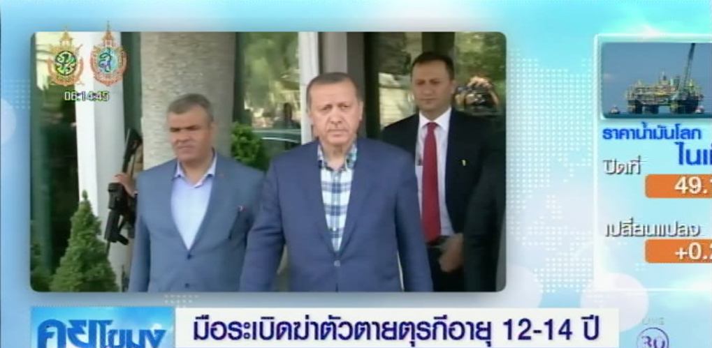 ตุรกี 22 ส.ค.- ผู้นำตุรกีเผยมือระเบิดฆ่าตัวตายกลางงานแต่งงาน เป็นเด็กอายุราว 12-14 ปี และเป็นสมุนของกลุ่มรัฐอิสลาม ยอดผู้เสียชีวิตพุ่ง 51 คน