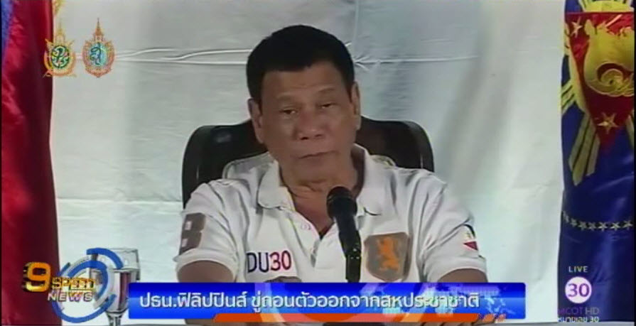 ฟิลิปปินส์ 21 ส.ค. – ประธานาธิบดีโรดริโก ดูเตอร์เต ประกาศขู่จะถอนตัวออกจากองค์การสหประชาชาติ หลังจากถูกท้วงติงให้ระงับแผนการปราบปรามยาเสพติด ด้วยการสังหารนักค้ายา พร้อมกับเตือนว่าอาจเชื้อเชิญจีนและประเทศอื่นๆ ตั้งองค์การนานาชาติเช่นเดียวกับสหประชาชาติขึ้นมาแทน ทั้งนี้สำนักงานสิทธิมนุษยชนของสหประชาชาติ ได้เรียกร้องให้ฟิลิปปินส์ ระงับนโยบายทำสงครามกับยาเสพติด หลังมีนักค้ายาถูกสังหารไปแล้วกว่า 900 คน นับแต่ประธานาธิบดีดูเตอร์เตขึ้นครองอำนาจ แต่มีการปฏิเสธว่านักค้ายาที่เสียชีวิต ไม่ได้เกิดจากฝีมือตำรวจ และยินดีให้สหประชาชาติเข้ามาสืบสวน. -สำนักข่าวไทย
