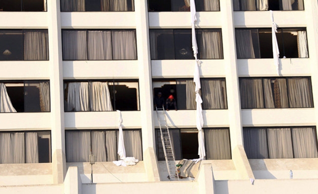 ภาพข่าวทางโทรทัศน์เห็นแขกโรงแรมใช้ผ้าปูที่นอนผูกเป็นเชือกโรยตัวออกทางหน้าต่างห้องพัก แขกบางคนกระดูกหักเพราะกระโดดลงมา บางคนถูกเศษกระจกบาด และหลายคนสำลักควัน รายงานระบุว่า มีชาวต่างชาติจำนวนหนึ่งในพักในโรงแรมนี้ และมีนักคริกเกตชื่อดังของปากีสถานหลายคนรวมอยู่ด้วย.-สำนักข่าวไทย
