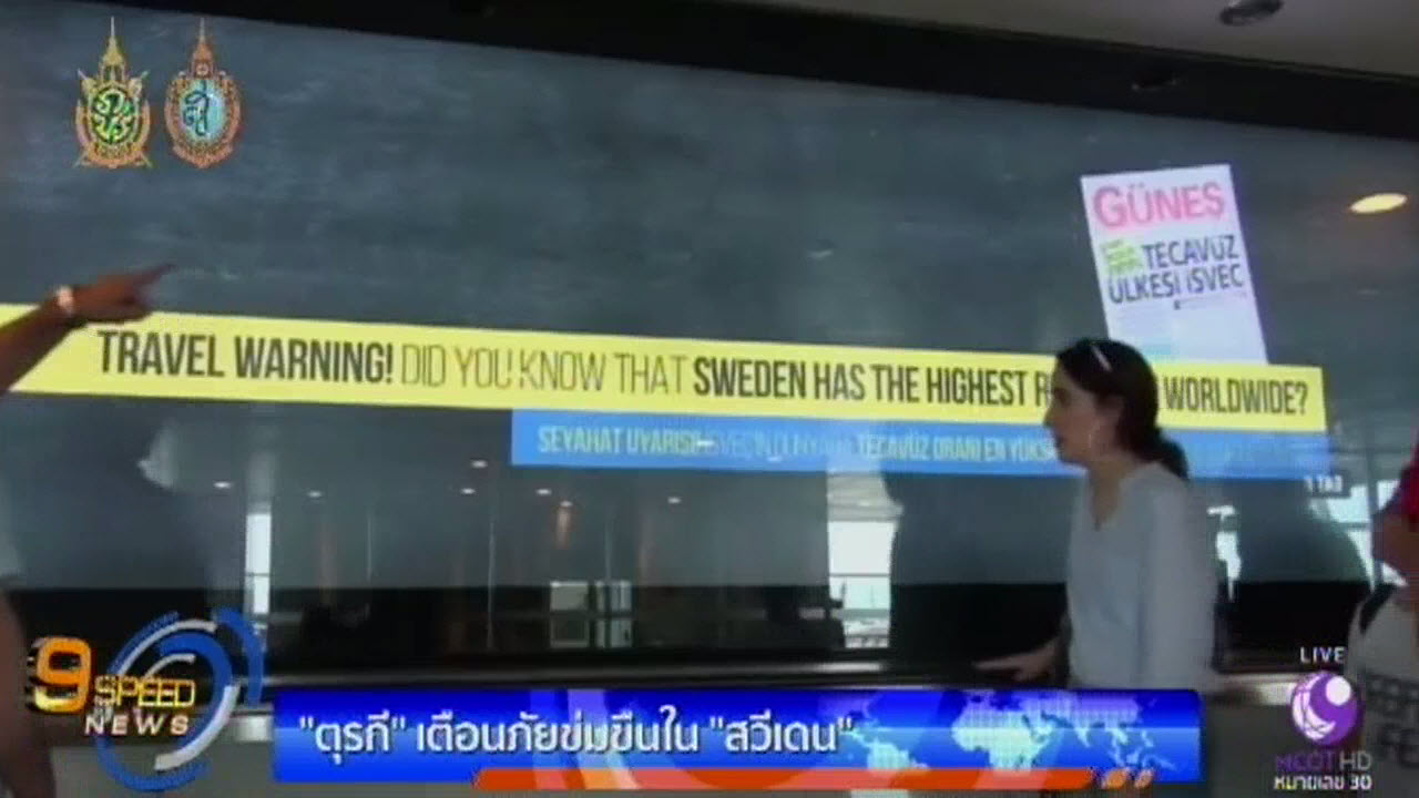 สนามบินอตาเติร์ก ในนครอิสตันบูลของตุรกี ขึ้นป้ายเตือนภัยการข่มขืนในสวีเดน ภายในอาคารผู้โดยสาร โดยมีข้อความระบุว่า “คุณรู้หรือไม่ว่าสวีเดนเป็นประเทศที่มีอัตราการก่อคดีข่มขืนมากที่สุดในโลก”