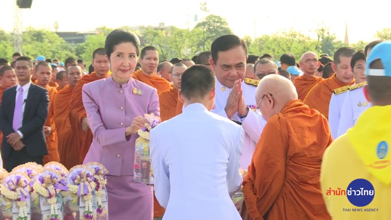 Prime Minister Prayut Chan-o-cha, also the chief of the National Council for Peace and Order, and his wife Naraporn led the people to give alms to 410 monks on the occasion of the birthday of Her Majesty Queen Suthida Bajrasudhabimalalakshana at the Sanam Luang ground.