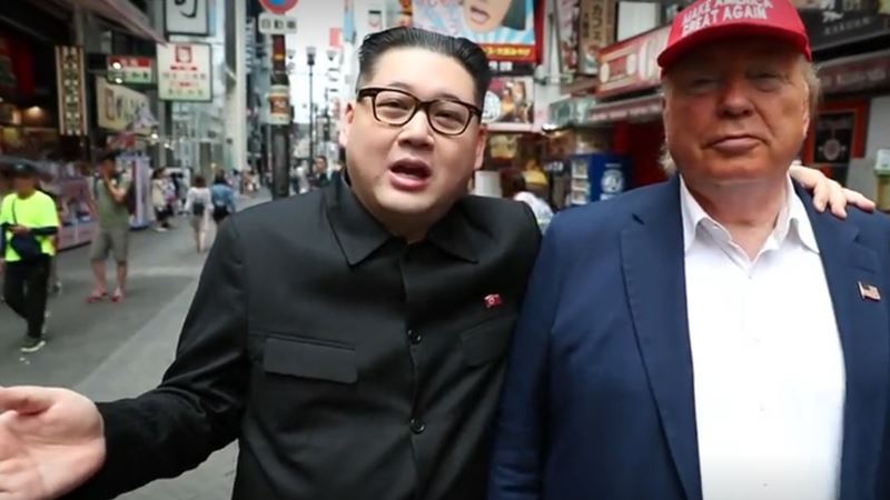 นายฮาเวิร์ด เอ็กซ์ นักแสดงตลกชาวออสเตรเลียแต่งตัวแต่งหน้าเลียนแบบผู้นำเกาหลีเหนือ และนายเดนนิส อลัน แต่งตัวแต่งหน้าเลียนแบบทรัมป์ เดินไปตามย่านชอปปิงในนครโอซากา เซลฟีกับคนที่เข้ามาขอถ่ายรูปด้วย และเดินชิมอาหารข้างทาง นายเอ็กซ์กล่าวกับกล้องโดยไปชี้ไปที่นายอลันว่า เป็นแขกของคนนี้ แม้เกาหลีเหนือยังไม่ได้เป็นสมาชิกจี 20 อย่างเป็นทางการ แต่ก็จะเป็นในเร็ว ๆ นี้ ดีใจที่ได้มาโอซากา เพราะต้องมาดูก่อนจะสั่งทิ้งระเบิดนิวเคลียร์ บอกได้เลยว่าอาหารที่นี่เยี่ยมมาก นอกจากนี้ยังได้พูดเรื่องจดหมายระหว่างผู้นำเกาหลีเหนือและผู้นำสหรัฐว่า ได้อ่านจดหมายของเขาแล้ว เขียนมาดีมากก็เลยเขียนตอบ ด้านนายอลันพูดว่า เขาชมว่าเป็นจดหมายที่หวานหยดย้อย