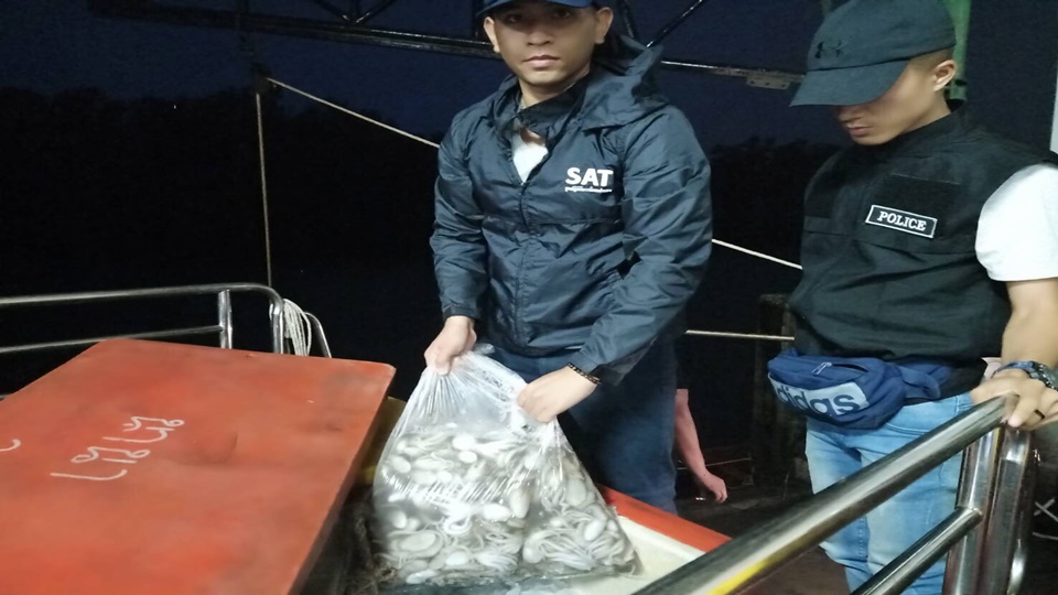 The arrest happened at PJ Pier in Bang Rin sub-district of Ranong’s provincial seat in the evening of June 26. Officials seized 23 containers of squids and mixed fish on their 9-gross-ton boat, said Pol Lt Gen Jaruwat Waisaya, chief of the police legal affairs bureau.