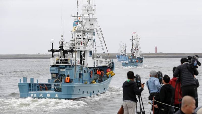 รายงานระบุว่า เรือล่าวาฬ 5 ลำแล่นออกจากท่าเรือเมืองคูชิโร ทางตอนเหนือของประเทศ การตัดสินใจถอนตัวจากคณะกรรมการการล่าวาฬระหว่างประเทศถูกตำหนิจากทั้งประเทศและนักเคลื่อนไหวที่ต่อต้านการล่าวาฬ แต่การกลับมาล่าเพื่อการพาณิชย์อีกครั้งได้รับการขานรับจากชุมชนล่าวาฬ มีการจัดพิธีส่งเรือ หัวหน้าสมาคมล่าวาฬกล่าวว่า อุตสาหกรรมล่าวาฬเป็นอุตสาหกรรมขนาดเล็ก และว่า ในบ้านเกิดของเขามีการล่าวาฬมากว่า 400 ปีแล้ว รายงานระบุว่า ยังมีเรือล่าวาฬออกจากเมืองท่าอื่นๆ ด้วยในเช้าวันนี้ รวมทั้งเมืองชิโมโนเซกิ ทางตะวันตกของญี่ปุ่น