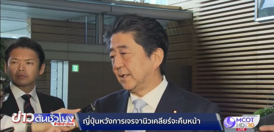 นายกรัฐมนตรีชินโซ อาเบะ ของญี่ปุ่น แสดงความคาดหวังว่าการพบปะระหว่างประธานาธิบดีโดนัลด์ ทรัมป์ ของสหรัฐ กับนายคิม จองอึน ผู้นำเกาหลีเหนือ ที่เขตปลอดทหารพรมแดนสองเกาหลีเมื่อวานนี้ จะนำไปสู่ความคืบหน้าในการเจรจาแก้ปัญหาขัดแย้งโครงการนิวเคลียร์เกาหลีเหนือ ซึ่งจะเป็นผลดีต่อสถานการณ์โดยรวมบนคาบสมุทรเกาหลี