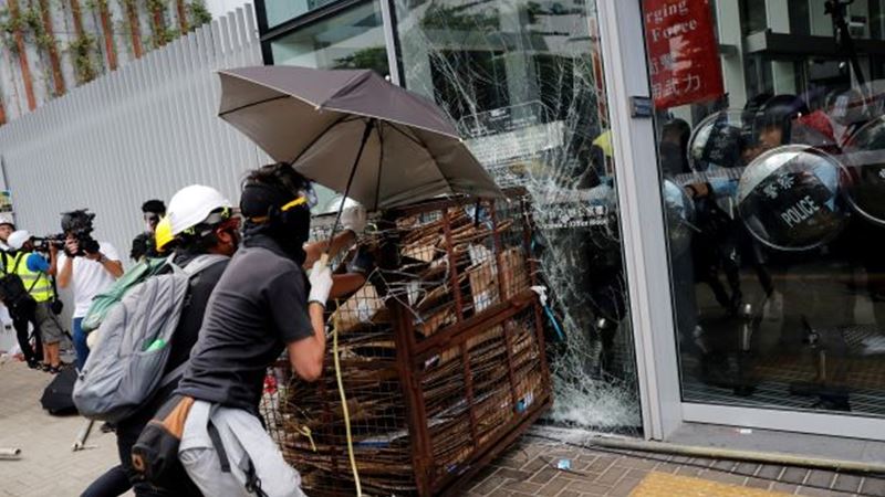เว็บไซต์บรรษัทกระจายเสียงอังกฤษหรือบีบีซีรายงานว่า ผู้ประท้วงกลุ่มหนึ่งใช้รถเข็นโลหะกระแทกกระจกซ้ำแล้วซ้ำเล่าตั้งแต่ช่วงเที่ยงตามเวลาฮ่องกงจนสามารถพังกระจกได้หนึ่งบาน แต่ยังไม่บุกเข้าไปข้างใน สมาชิกสภานิติบัญญัติฝ่ายสนับสนุนประชาธิปไตยบางคนพยายามเอาตัวขวางผู้ประท้วงเพื่อเกลี้ยกล่อมให้ยุติการใช้ความรุนแรงแต่ไม่สำเร็จ ด้านผู้สื่อข่าวซีเอ็นเอ็นรายงานว่า ตำรวจปราบจลาจลที่ตั้งรับมืออยู่ข้างในอาคารพยายามสื่อสารกับผู้ประท้วงด้วยไมโครโฟน เตือนว่าอย่าบุกเข้ามา แต่จับใจความคำพูดได้ไม่ชัดเจนนัก