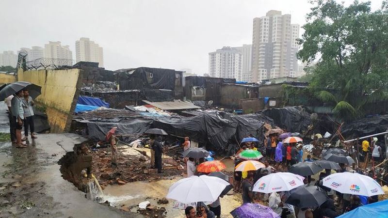 เจ้าหน้าที่หน่วยดับเพลิงอินเดียเปิดเผยว่า เหตุกำแพงพังถล่มเกิดบริเวณเชิงเขาในเขตมาลัด ชานเมืองทางตะวันตก เจ้าหน้าที่หน่วยกู้ภัยยังคงระดมกำลังให้ความช่วยเหลือ และสามารถช่วยประชาชนออกมาได้กว่าสิบคน รายงานระบุว่า ในบางพื้นที่มีปริมาณฝนตกกว่า 300 มม. (11.8 นิ้ว) ในรอบ 24 ชั่วโมง ทำให้เกิดน้ำท่วมถนนและรางรถไฟ ซึ่งแต่ละวันมีประชาชนใช้ในการเดินทางไปทำงานหลายล้านคน อย่างไรก็ตาม คาดว่า ในวันนี้จะยังคงมีฝนตกหนักอย่างต่อเนื่อง ทางการประกาศเตือนให้ประชาชนอยู่แต่ภายในอาคาร เว้นแต่กรณีเกิดสถานการณ์ฉุกเฉิน