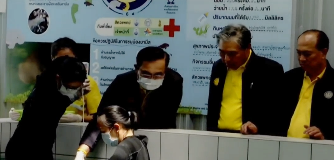 Gen Prayut fed Yamil with milk and inquired about its care. He also thanked all officials including veterinarians who took good care of orphaned baby dugongs. He said he wished them to grow fast and healthily.