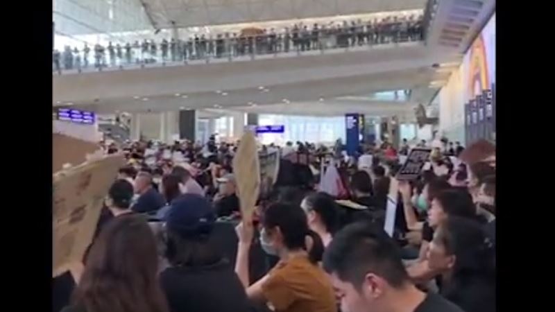 ผู้ประท้วงนั่งปักหลักบนพื้นอาคารผู้โดยสารขาเข้า ถือป้ายเรียกร้องให้รัฐบาลถอนร่างกฎหมายส่งตัวผู้ร้ายข้ามแดนที่ค้างอยู่ในสภาออกไป เสียงตะโกนคำว่า “ปลดแอกฮ่องกง” ดังก้องไปทั่วอาคาร นายเจเรมี ทัม อดีตนักบินและสมาชิกสภานิติบัญญัติที่เป็นแกนนำจัดการประท้วงวันนี้ร่วมกับพนักงานด้านการบินกล่าวว่า โลกจับตาฮ่องกงมาตลอดหลายสัปดาห์ พวกเขาจึงคิดว่าท่าอากาศยานคือสถานที่ที่จะชี้แจงต่อนักท่องเที่ยวได้โดยตรงที่สุดว่าเกิดอะไรขึ้นในฮ่องกง ผู้ประท้วงบางส่วนแจกจ่ายใบปลิวชี้แจงสถานการณ์ให้แก่นักท่องเที่ยว ขณะที่บางส่วนประณามตำรวจที่ไม่ปกป้องประชาชนและผู้ประท้วงที่ถูกกลุ่มคนร้ายสวมเสื้อขาวไล่ตีในสถานีรถไฟใต้ดินเมื่อวันอาทิตย์ อันเป็นเหตุการณ์ที่สร้างความตกตะลึงไปทั่ว แหล่งข่าวตำรวจเผยว่า คนร้ายบางส่วนเป็นสมาชิกแก๊งอันธพาล