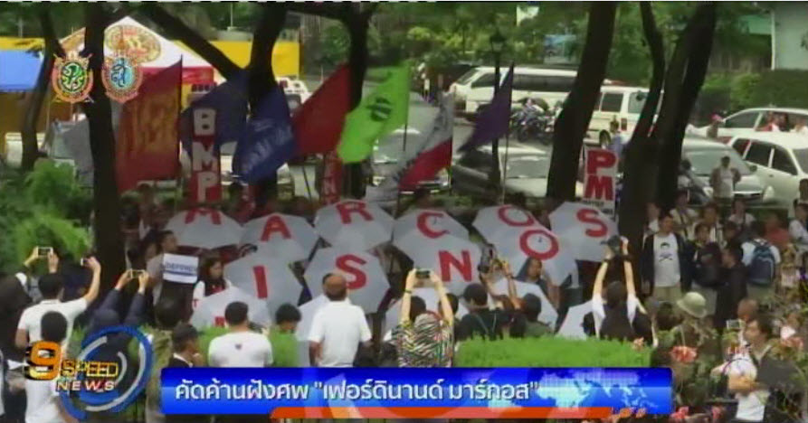 ฟิลิปปินส์ 14 ส.ค. – ชาวฟิลิปปินส์ชุมนุมประท้วงแผนของประธานาธิบดีโรดริโก ดูเตอร์เต ที่จะนำร่างนายเฟอร์ดินานด์ มาร์กอส อดีตผู้นำฟิลิปปินส์ ที่ถูกพลังประชาชนโค่นจากตำแหน่ง ไปฝังที่อนุสรณ์สถานวีรบุรุษ ที่จตุรัสรีซัล ปาร์ค โดยได้นำป้ายข้อความ มาร์กอสไม่ใช่วีรบุรุษ มายังที่ชุมนุม โดยผู้ประท้วงต้องการให้ประธานาธิบดีดูเตอร์เต ทบทวนการตัดสินใจอีกครั้ง รายงานแจ้งว่า กลุ่มฝ่ายซ้ายเตรียมร้องต่อศาลสูงฟิลิปปินส์ให้สั่งระงับการฝังศพ เพราะไม่ยุติธรรมต่อผู้คนที่ถูกนายมาร์กอสละเมิดสิทธิมนุษยชน. -สำนักข่าวไทย