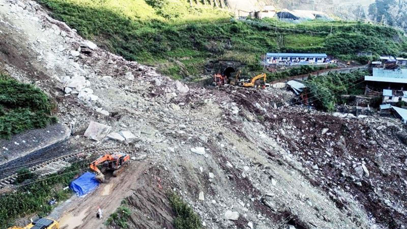 รายงานระบุว่า เนินเขาที่ชุมน้ำทรุดตัวลงฝังช่วงหนึ่งของทางรถไฟที่กำลังอยู่ระหว่างซ่อมแซมที่เขตก่านลั่ว โดยจนถึงขณะนี้เจ้าหน้าที่กู้ภัยสามารถช่วยคนงานออกมาได้แล้ว 11 คน แต่ยังมีคนงานอีก 17 คน ที่สูญหายไปตั้งแต่วันพุธ และจนถึงวันศุกร์ก็ยังหาไม่พบ