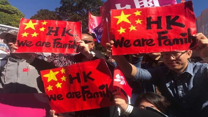 ผู้ชุมนุมตะโกนคำว่า One China ขณะเคลื่อนขบวนไปพร้อมกับโบกธงชาติจีนและถือป้ายเรียกร้องให้ยุติความรุนแรงในฮ่องกง ผู้จัดการชุมนุมซึ่งเป็นทนายความในซิดนีย์กล่าวว่า เกิดเหตุรุนแรงและการประท้วงรุนแรงในฮ่องกงมากมาย ชาวฮ่องกงต้องเดือดร้อนจากการกระทำเหล่านั้น พวกเขาจึงออกมาเรียกร้องให้ฮ่องกงเกิดสันติและความเป็นระเบียบเรียบร้อย