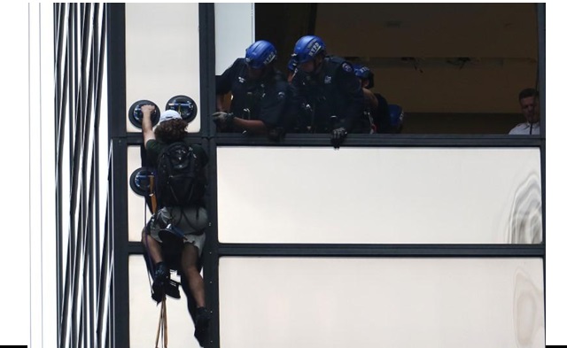 นิวยอร์ค 11 ส.ค. – ชายหนุ่มปีนด้านนอกอาคารทรัมป์ ทาวเวอร์ ซึ่งเป็นที่พักในนครนิวยอร์คและสำนักงานของนายโดนัลด์ ทรัมป์ ผู้สมัครชิงตำแหน่งประธานาธิบดีสหรัฐจากพรรครีพับลิกันเป็นเวลา 3 ชั่วโมง ก่อนที่ตำรวจจะจับตัวเขาได้ทางหน้าต่างของอาคาร